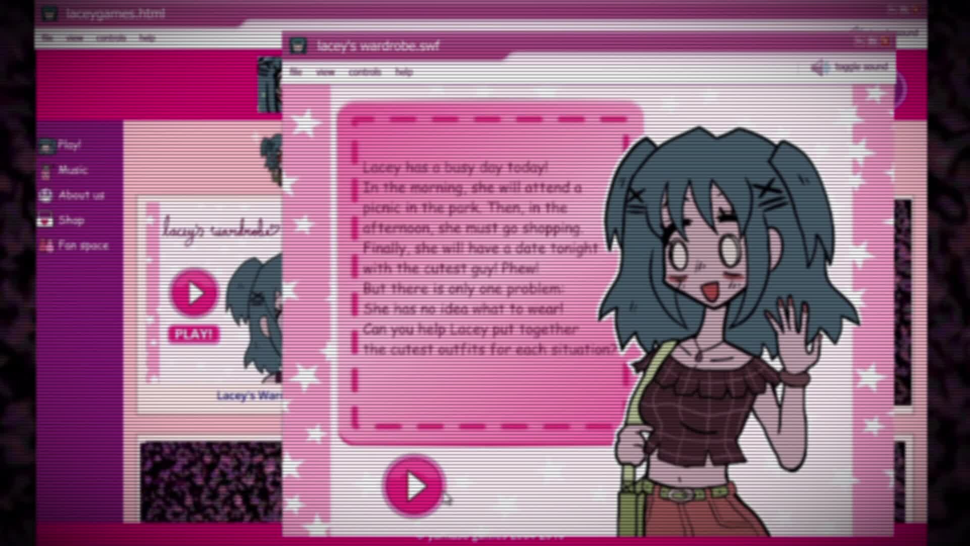 These are the REAL girls’ games. In the mid 2000s, Charlie (Charchar887), discovers the Laceys's Flash Games and their disturbing secrets. Step into the virtual world to uncover the whereabouts of the missing website creator, Rocio Yani, and explore all the games and activities with Lacey!