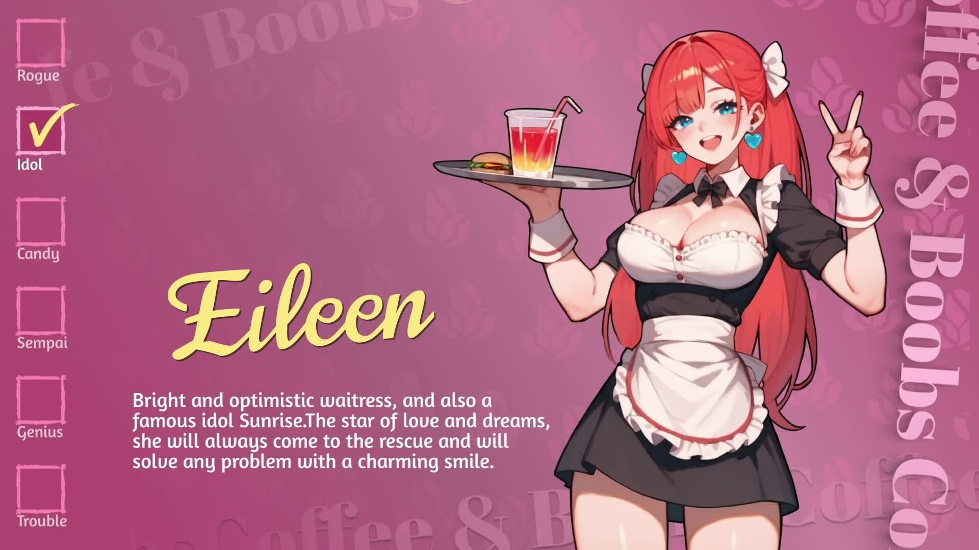Coffee & Boobs is a 2D visual novel about a cozy coffee shop where the staff is hotter than a morning espresso. Help the hero fulfill his dream - to become the greatest barista and brew the kind of coffee that will make any date a success!