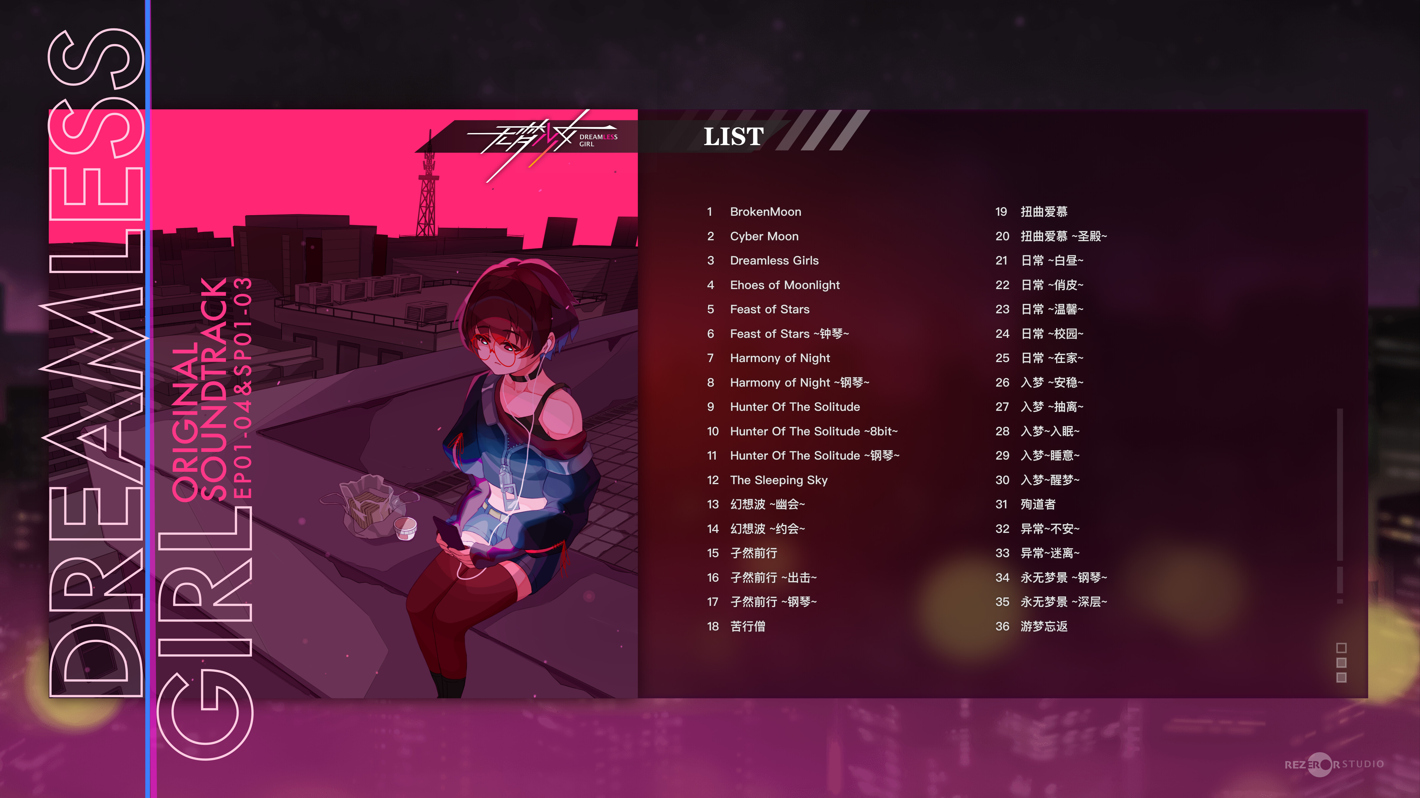 The game audio collection for “DreamlessGirl”, currently includes 36 instrumental tracks composed for the game.