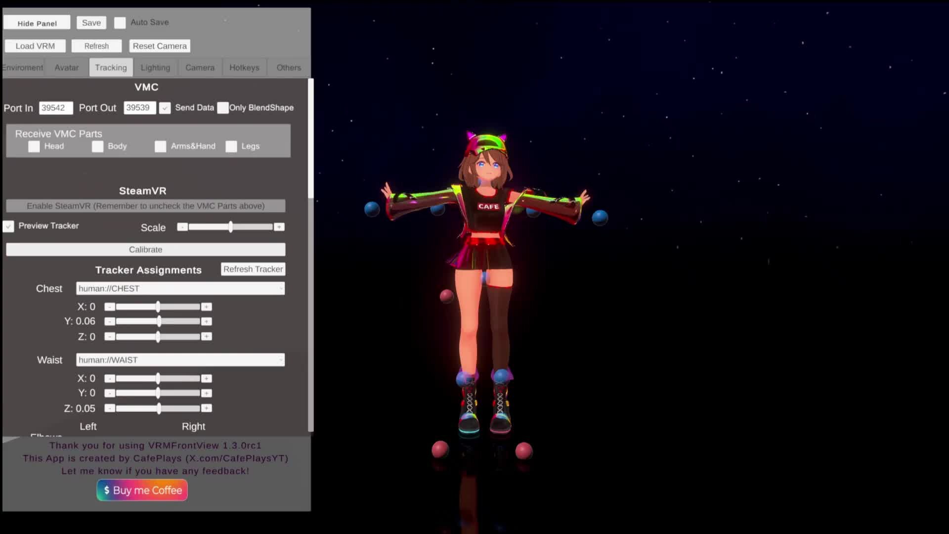 VrmFrontView: Free app for content creators/VTubers to record or stream VR gameplay with personalized VRM avatars overlaid. Supports mixed reality (e.g., LIV), VMC protocol for avatar animation, custom backgrounds, and hotkey control.