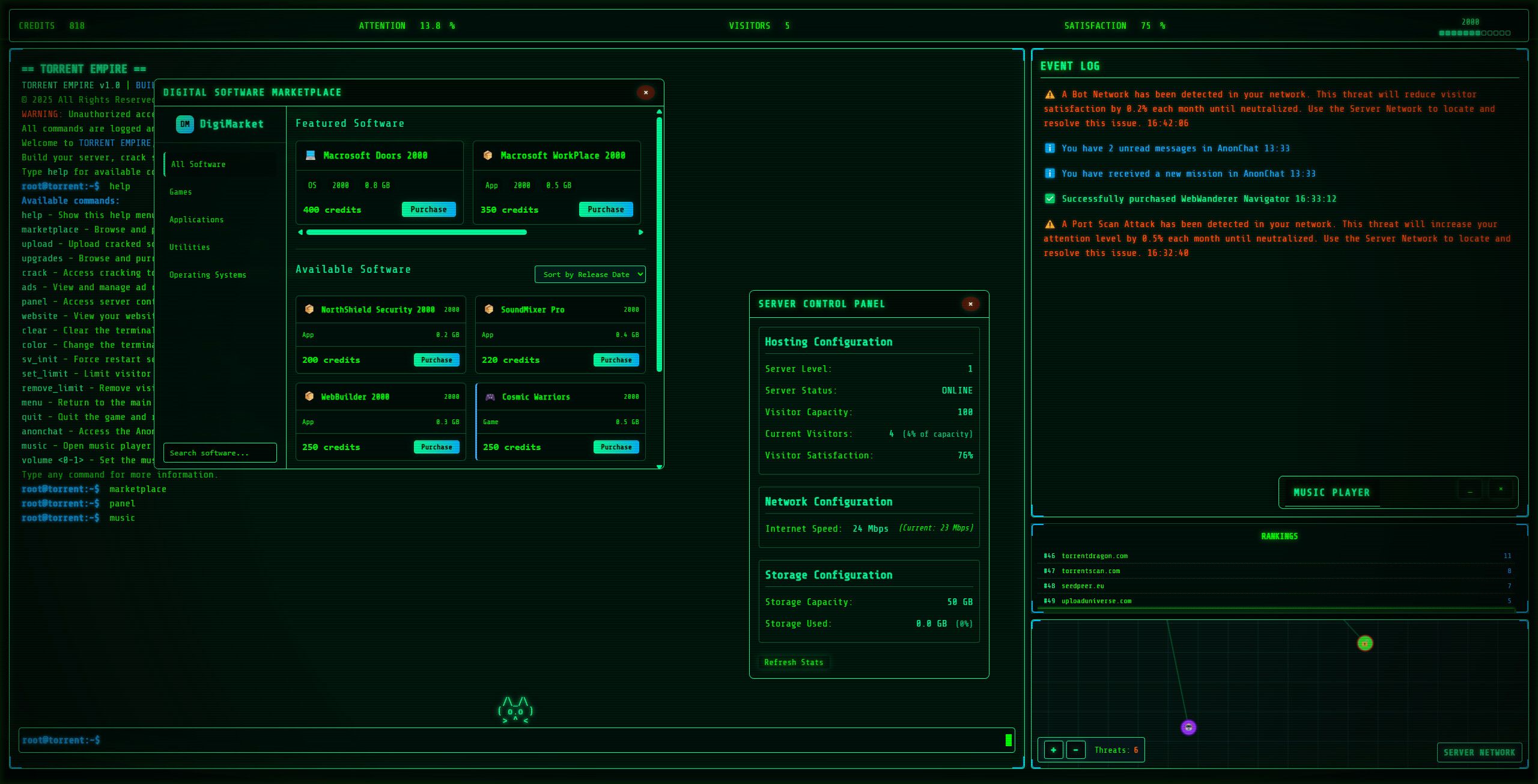 Are you ready to build your own torrent empire with the Torrent Empire Demo version? Crack software, manage your servers, dive into dark missions, and evade the authorities. Dance between risk and reward in this terminal-based strategy simulation. Become a digital legend or lose everything!