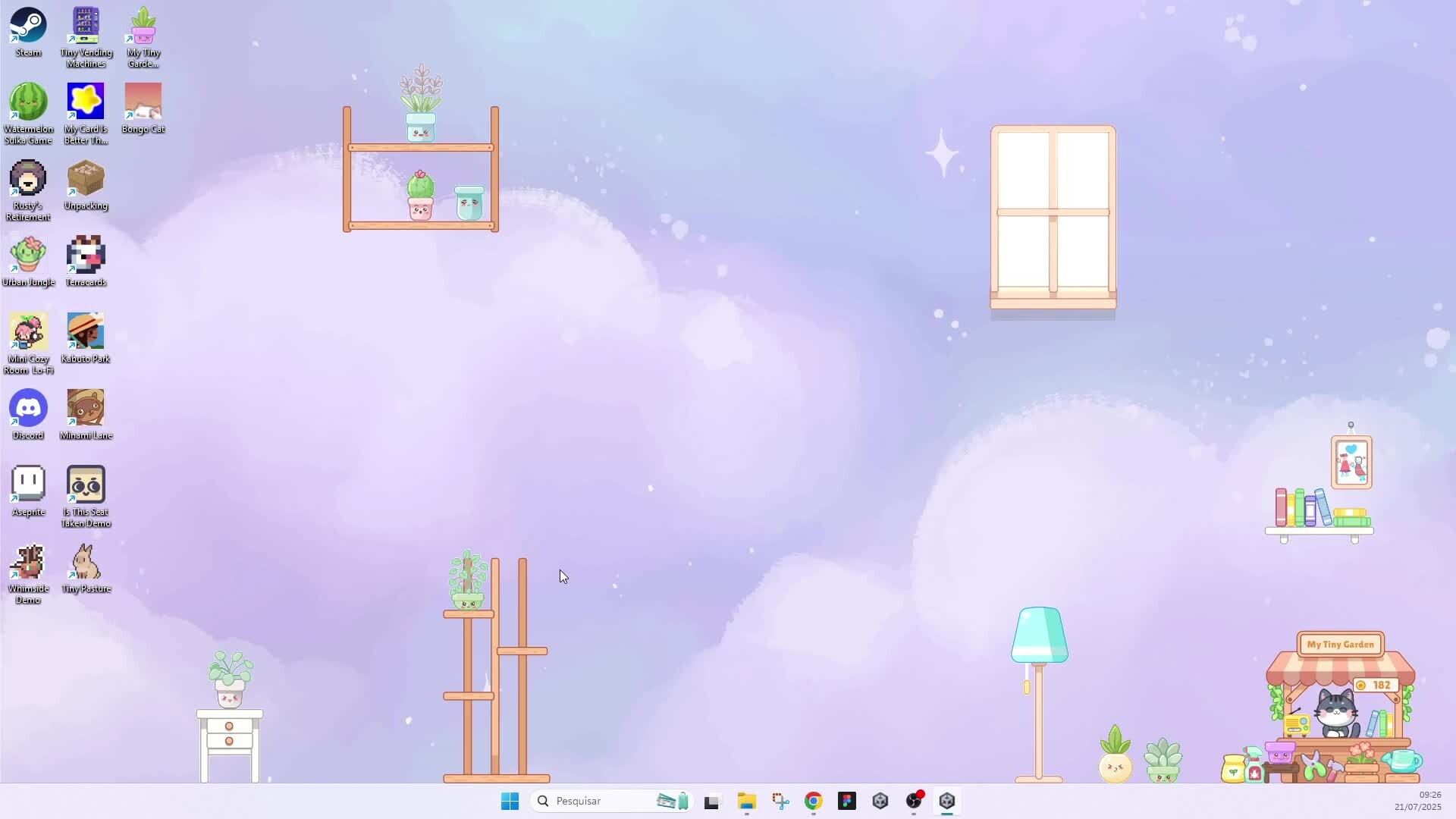 My Tiny Garden is a cozy idle game that runs at the bottom of your screen. Plant cute plants, water, fertilize, and prune them. Earn coins to unlock new pots, plants, and stands. Decorate your desktop and relax while working, studying, or browsing.