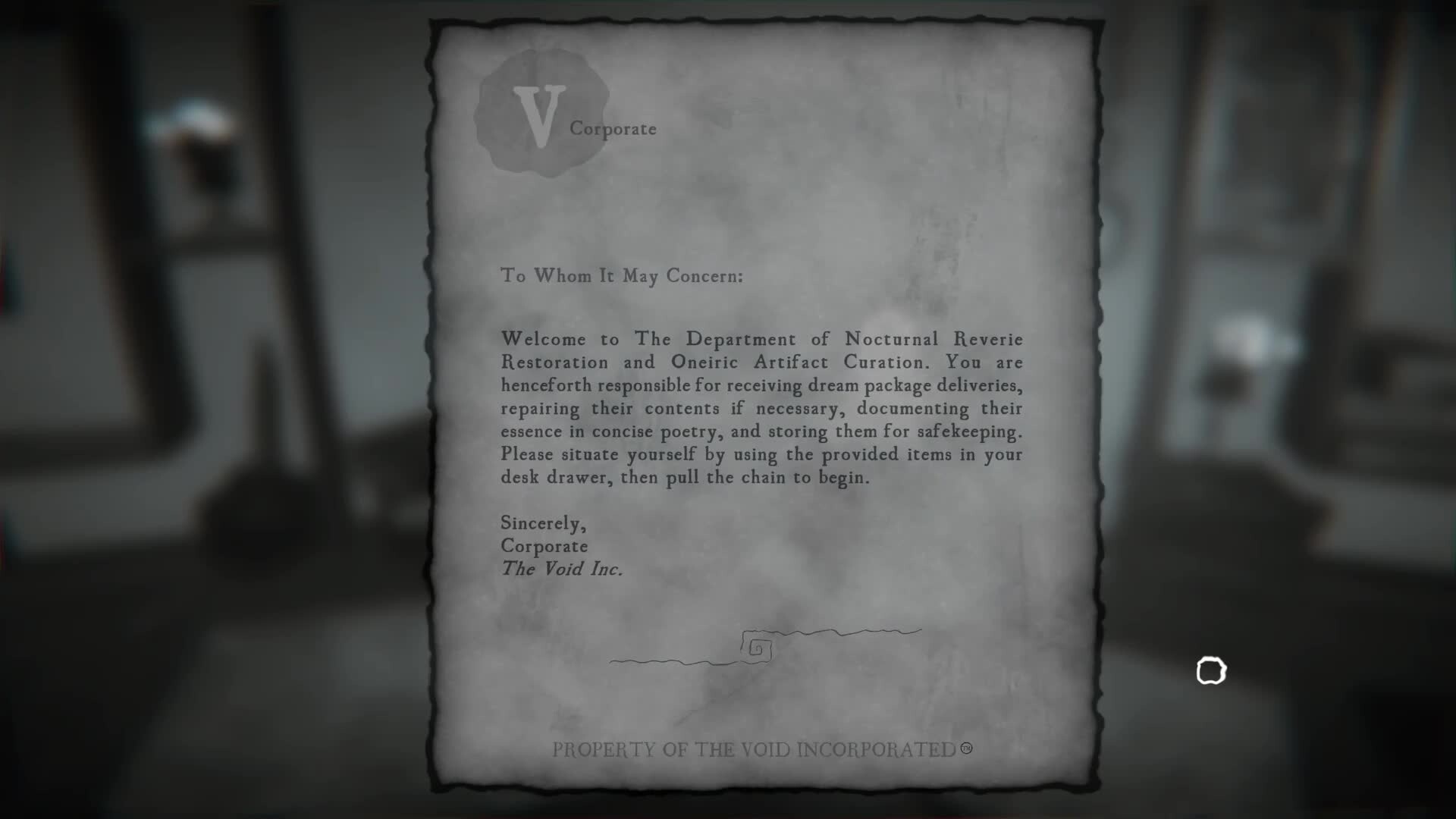 Greetings from the Corporate Offices of The Void Incorporated. In this creepy cozy experience, you will be responsible for handling, repairing, documenting, and collecting dreams. Though simple and relaxing, your work is vital to keeping reality intact.