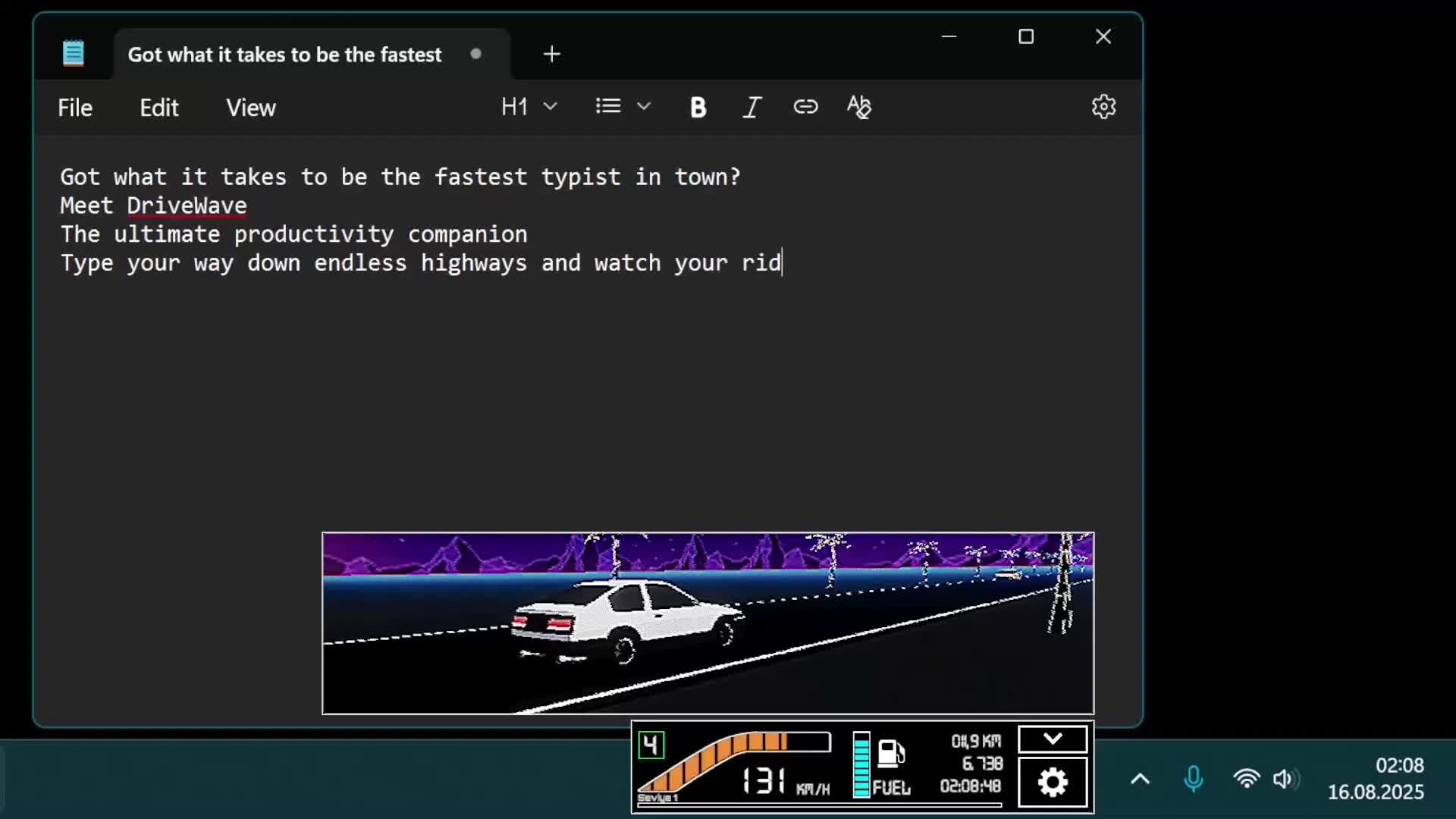 Every keystroke powers your car across endless neon highways, from glowing deserts to midnight forests. Collect, customize, and embark on a driving journey, all while boosting your productivity.