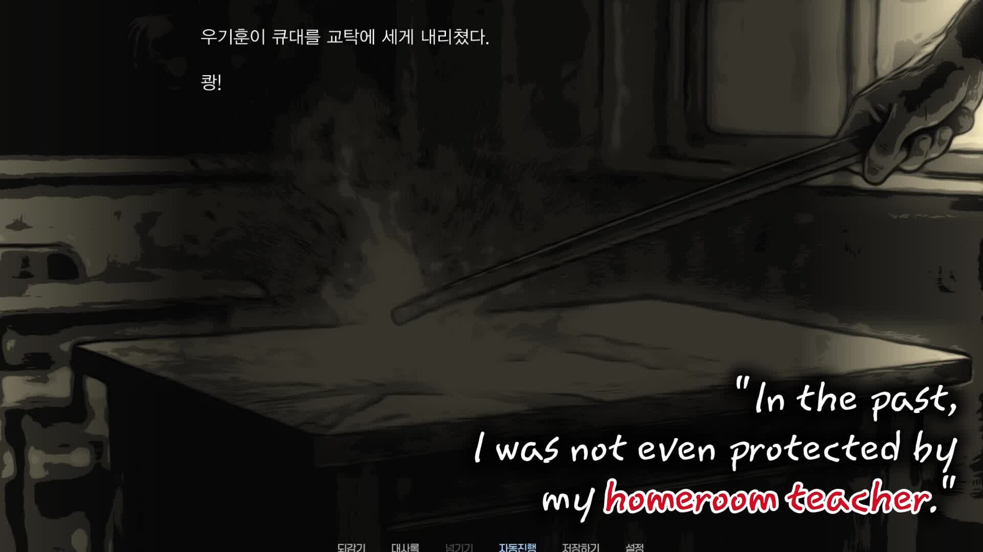 A free, story-driven short visual novel with no choices. The narrative weaves between the present (202X) and the past (200X), depicting the suffocating chain of violence within a Korean school setting with stark realism.