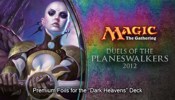 Convert all uncommon, rare, and mythic rare cards in the “Dark Heavens” white and black deck to premium foil cards. Additional content for Magic: The Gathering — Duels of the Planeswalkers 2012. (Requires the most recent version of Magic 2012 and Magic 2012 Deck Pack 2.)