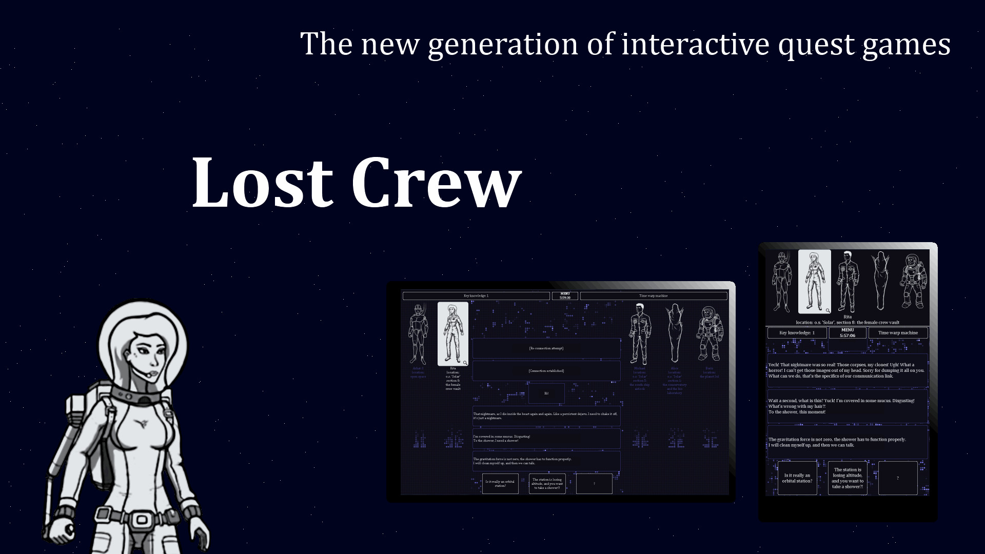 This is text adventure game of survival of the astronauts on the orbital station that is lost in time. You will have to take care of the rescue of the station's crew, and lots of complicated riddles and situations will make this adventure even more interesting.