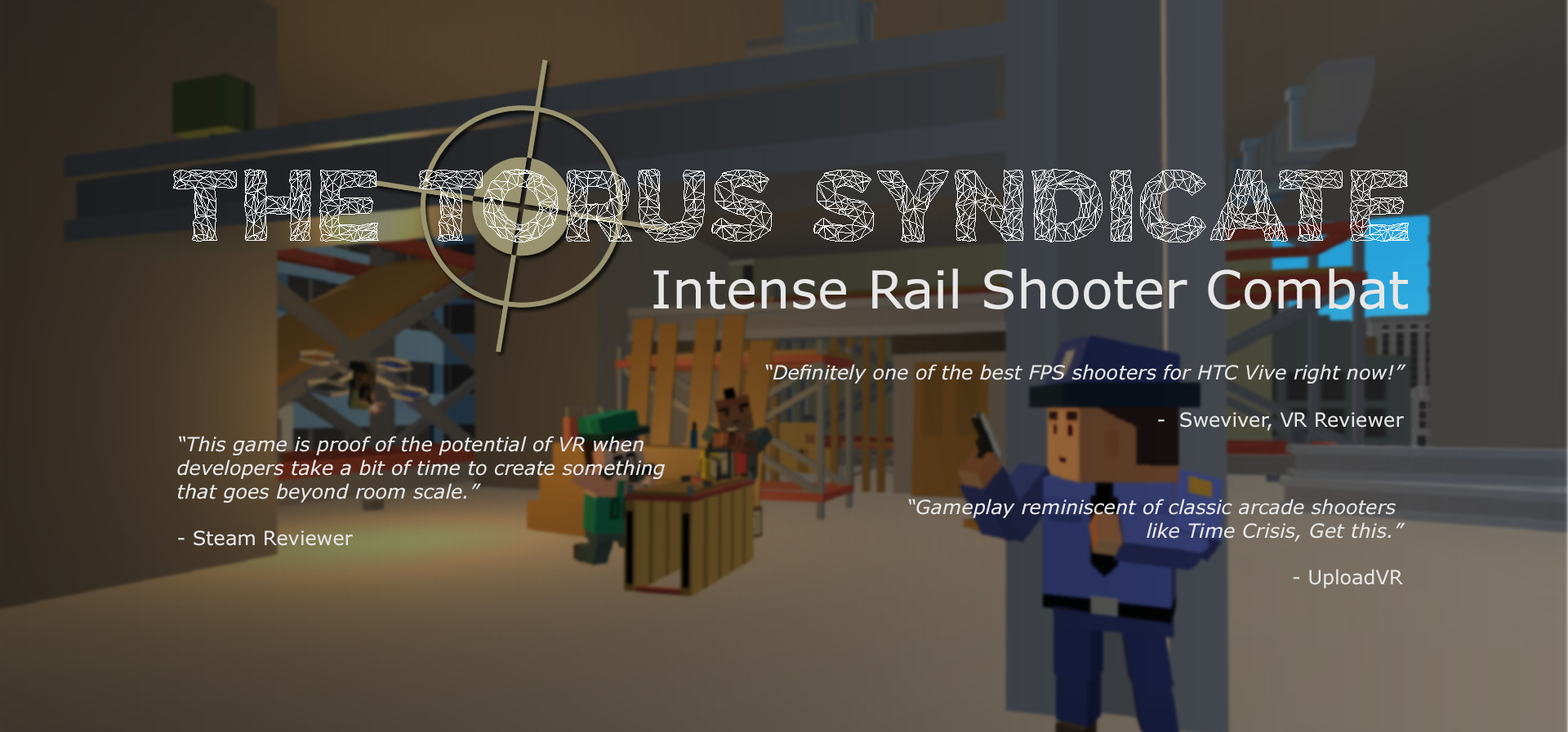 Experience the intense, non-stop action of the arcade rail-shooter in virtual reality! Play as Lucas Lawson, a rookie cop swept into the dramatic underworld of the Torus Syndicate. Put your shooting and dodging skills to the test as you battle across metropolis in a quest for justice.