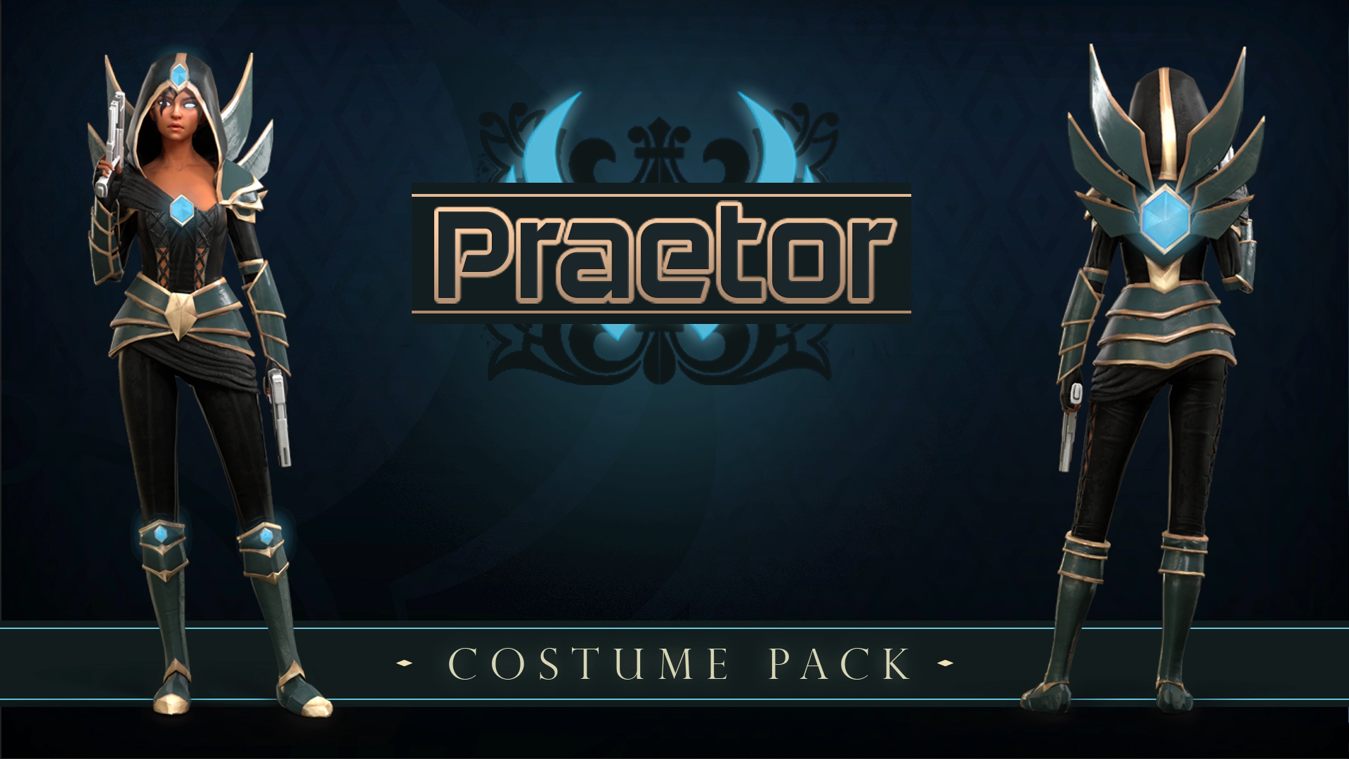 The Seraph becomes our protector with the Praetor costume pack! The shining green plate is detailed with gold trim, black leather leggings and top, hood and glowing blue crystal gemstones