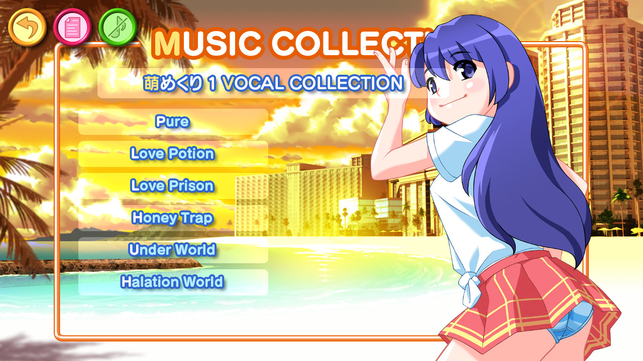 It is a soundtrack of "Moe Mekuri 1 - VOCAL COLLECTION -" that you can listen at the MUSIC COLLECTION of the game menu. The songs included in this soundtrack are only short version.