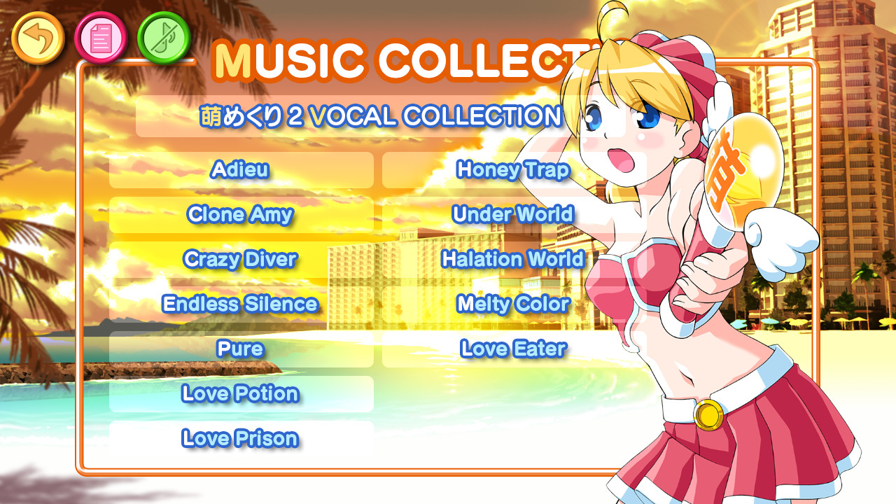 It is a soundtrack of "Moe Mekuri 2 - VOCAL COLLECTION -" that you can listen to at the MUSIC COLLECTION of the game menu. The songs included in this soundtrack are long versions on the soundtrack CD.