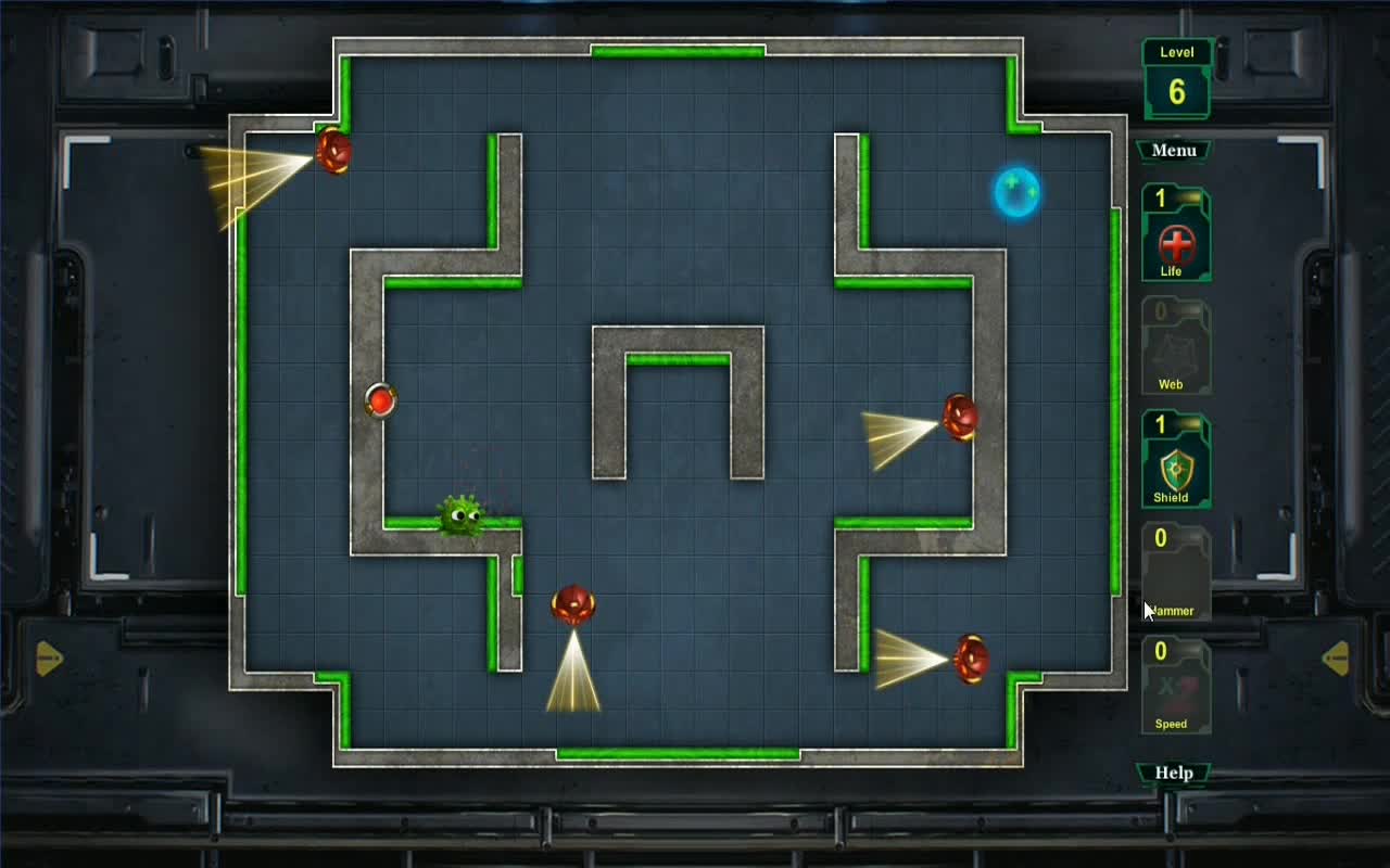 A large and bright game that includes multiple levels of various complexity. Hit the robot to destroy it. The level is complete when there are no scout robots on the field. Collect bonus items. Use the interface on the right to apply them. The complexity grows with the levels.