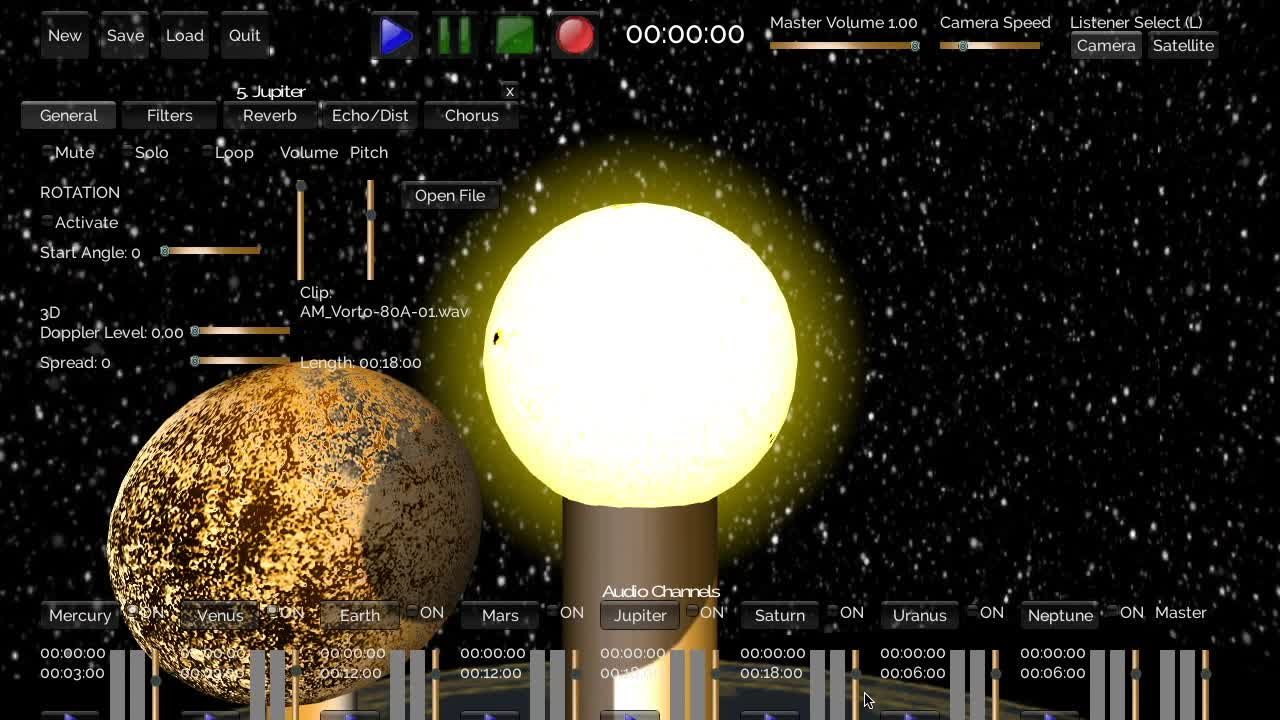 Aurrery is a unique digital audio workstation which allows the user to create real 3D music using a 3D model of the solar system (an audio orrery).