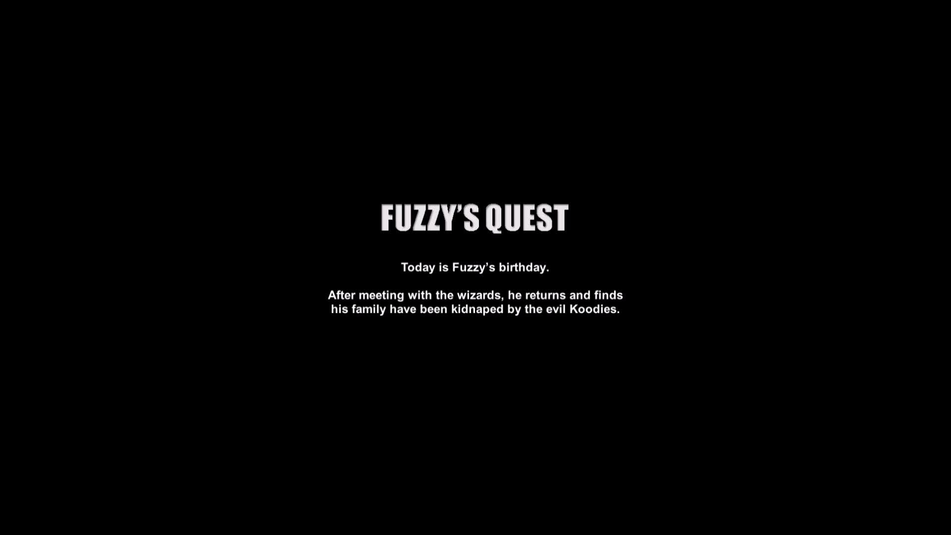 Its Fuzzy’s birthday today and wishes is to become a wizard. During his visit to the wizard’s palace, the evil Koodies invade the party his family were preparing. When Fuzzy returns, he finds his family have been kidnapped and his party ruined. He sets off on a mission. Will he find his family?
