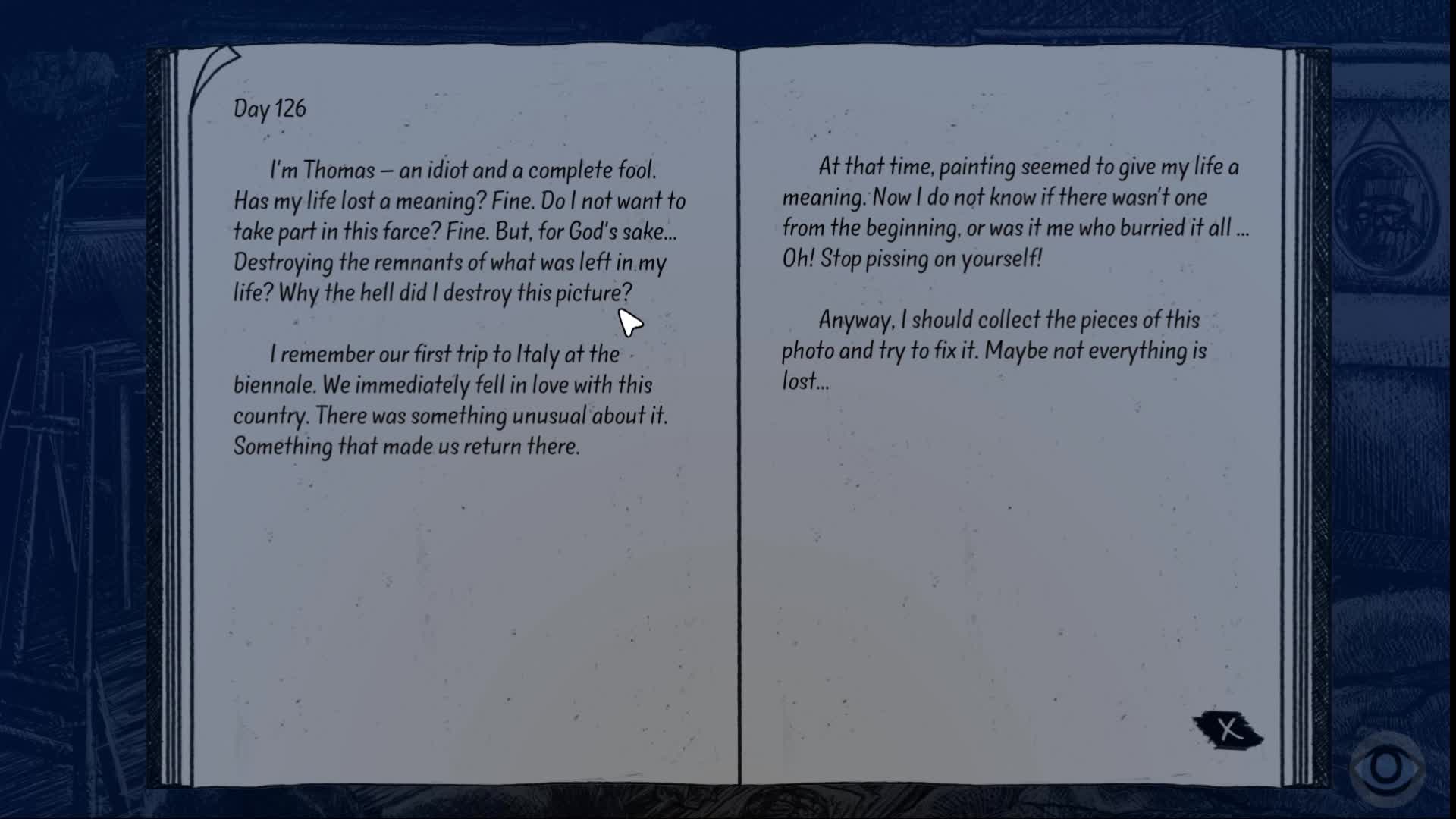 Indygo is a narrative game with elements of point'n'click set in one room only - painting workshop. It tells the story of a painter who suffers from depression. Solve puzzles and make decisions that affect how the game ends. Indygo attempts to show how people with depression can feel.