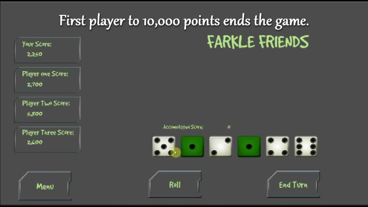 Play farkle and get the highest score to win. Compete with your friends to see who can get the highest scores. It takes a good strategy and planning to win, can you beat your opponents and win? Farkle Friends is an addicting fun game.