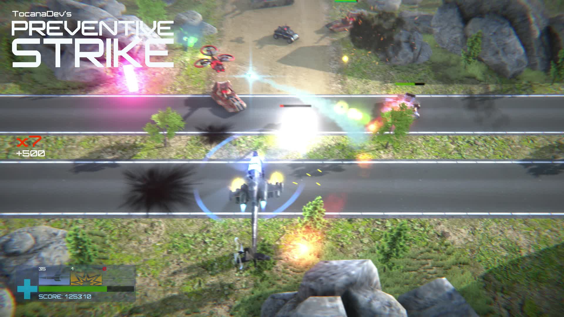 Preventive Strike is a dynamic arcade scroll-shooter created by a single developer. You control an overpowered attack helicopter with the objective to drive the enemy out of your land and make your way to the enemy base and eliminate the threat. They don't know what's coming, but neither do you!