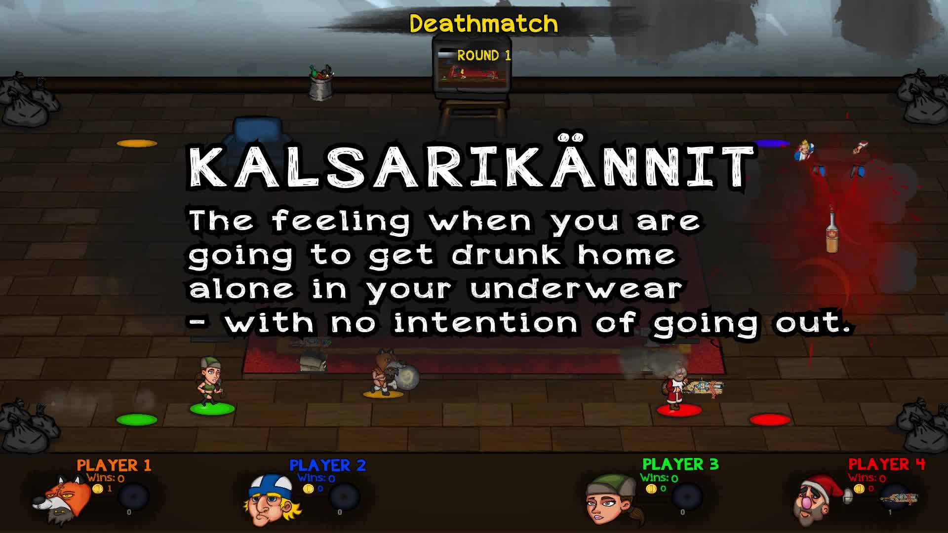 Drunkenpants is a game where ordinary heroes who got drunk in their underpants at home (Kalsarikänni) try to solve mundane problems with excessive violence. The game is an action based, fast-paced multiplayer battle game, where you compete in different game modes and try to beat your opponents.