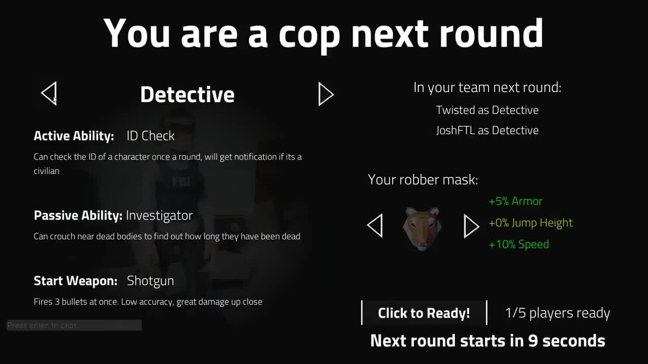 Perfect Heist is a round-based online game, where the robber team tries to execute a bank robbery without getting noticed, and the cop team tries to prevent it. Robbers hide in plain sight and try to slowly infiltrate the bank while the Cops try to figure out who is a normal customer, and who is a robber!