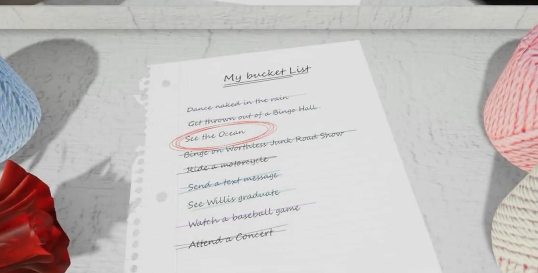 Grandma, with only 7 days of life remaining, has but one dying wish yet to be crossed from her bucket list. She wants to witness firsthand the majesty and beauty of the ocean. Do whatever it takes to make it happen.