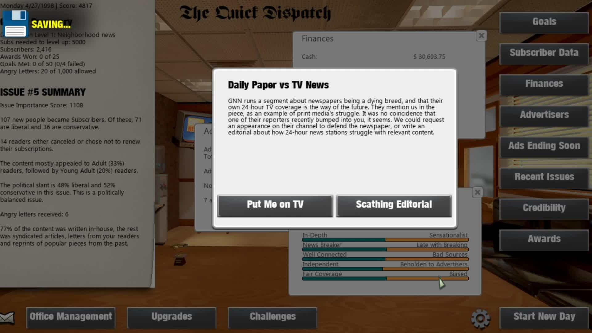 Strategy sim game where you build a newspaper! Hire reporters, assign them stories and create amazing front pages! Balance advertisers and politics as you grow the subscriber base. Win awards, complete goals and challenges, research new technology and choose your path as events unfold.