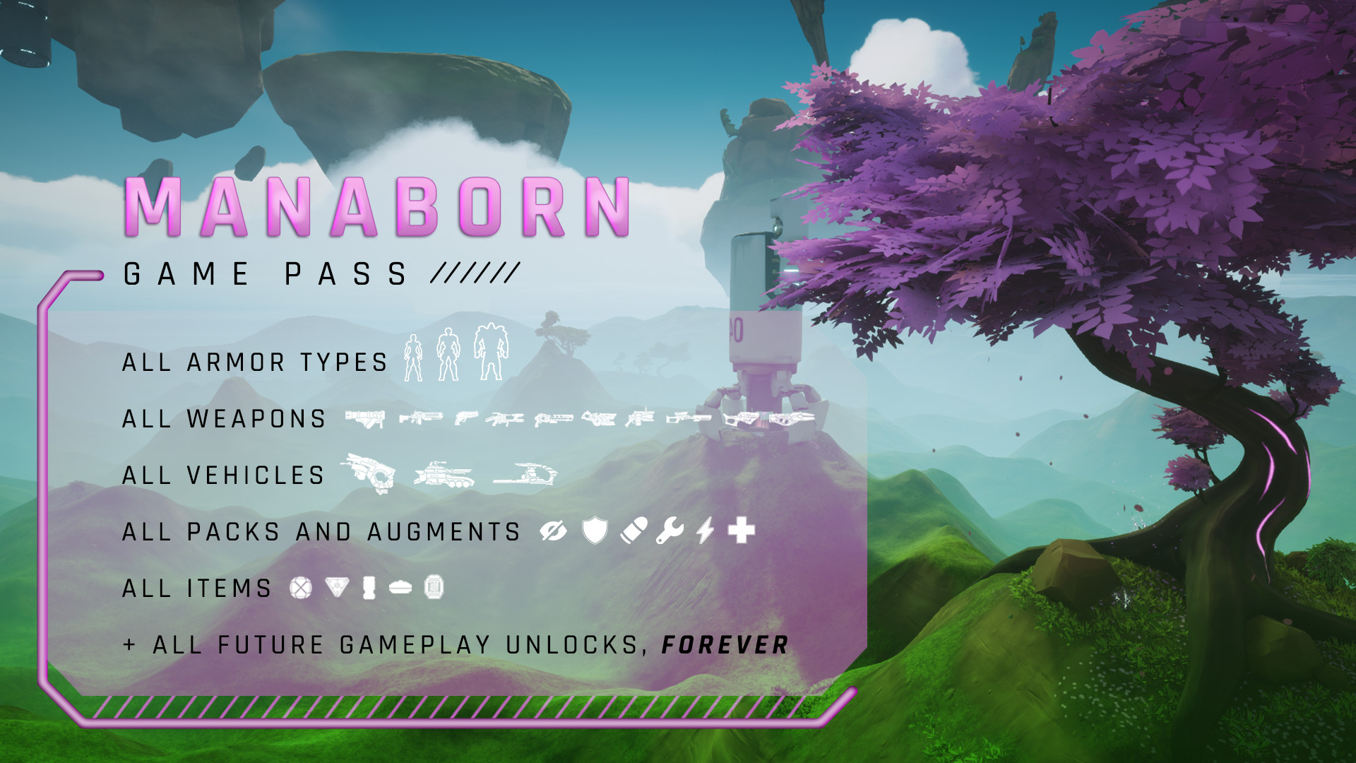 The Midair Manaborn Game Pass unlocks all of the gameplay unlockables in Midair such as armor types, weapons, packs & augments, and items, FOREVER. If we add new gameplay content, you'll get it immediately. Pay once to unlock all current and future gameplay content forever.