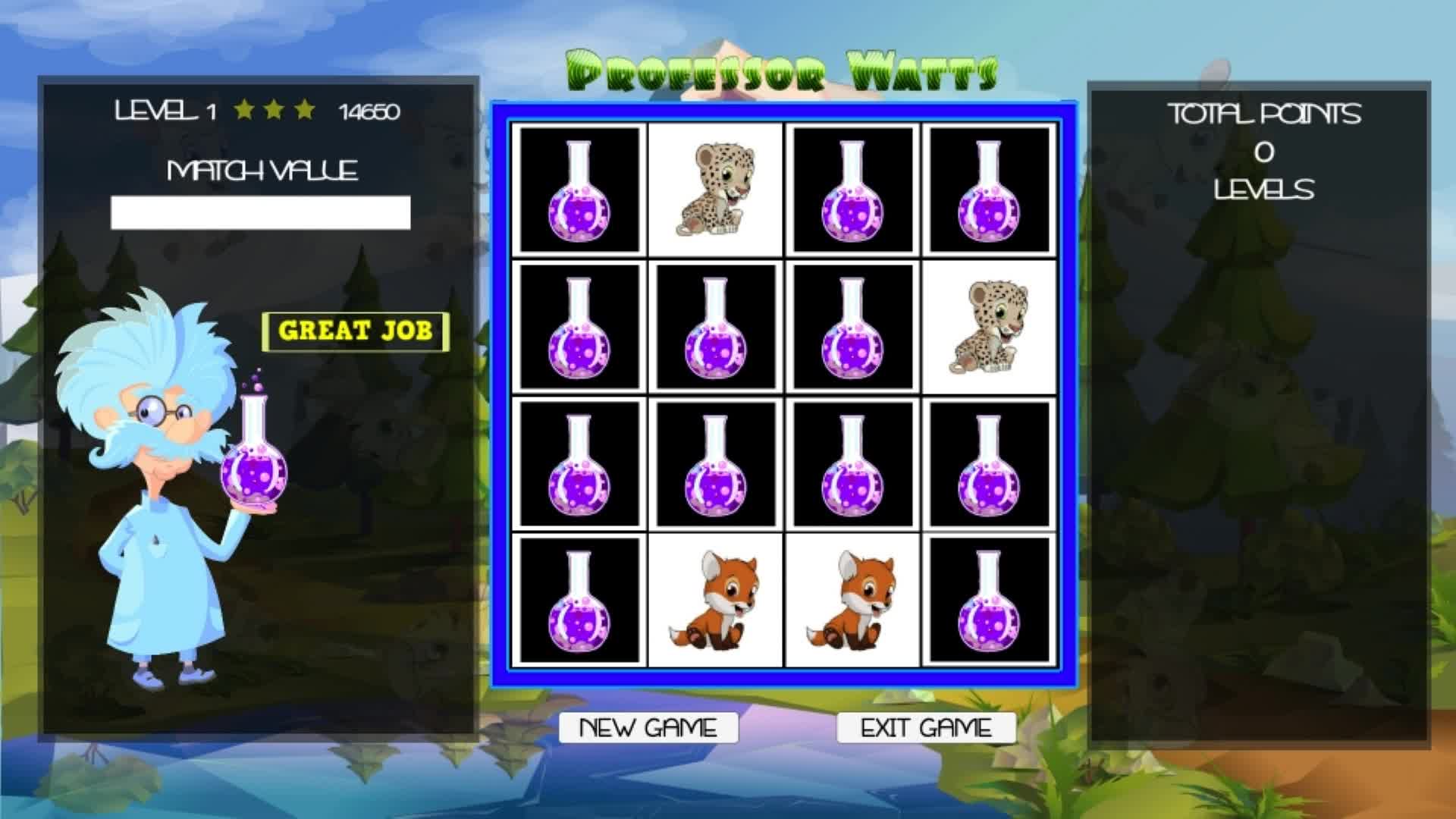 Hello Professor Watts here and I have some research to do on memory skills. I have assembled a wide variety of cute animals to put our memory to the test. We can see how we're doing by completing matches in a specific amount of time and earning points to track our overall progress.
