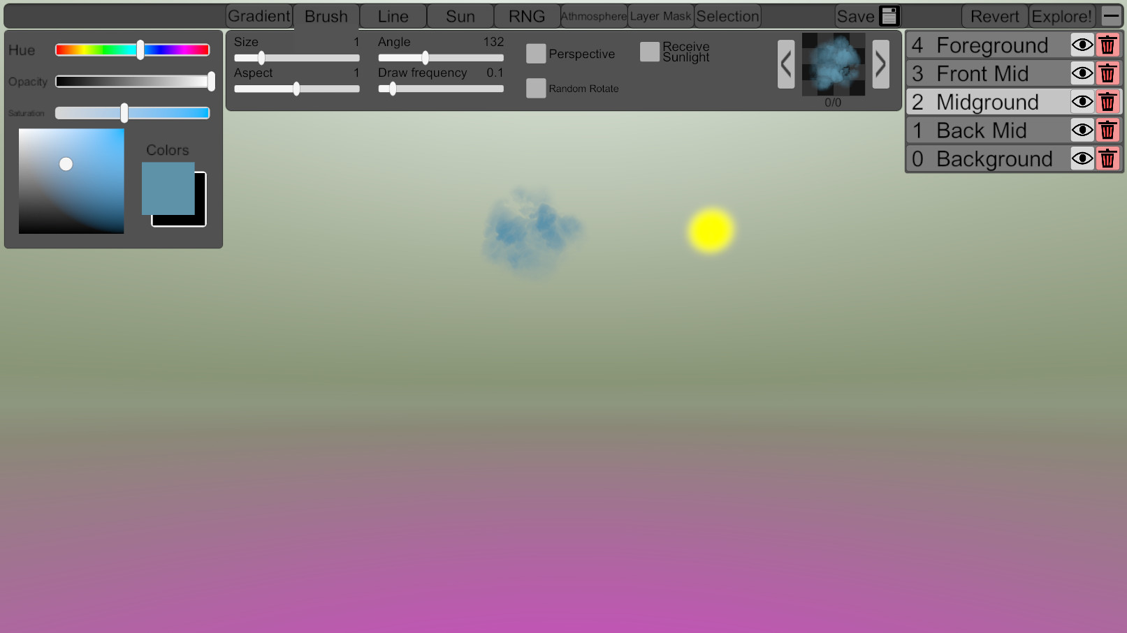 Skybox Painter 3D is a painting tool, that can be used to paint skies in a 360 degree environment. It has a lot of features, that were optimized for the purpose of drawing skies like for example light calculations for clouds.