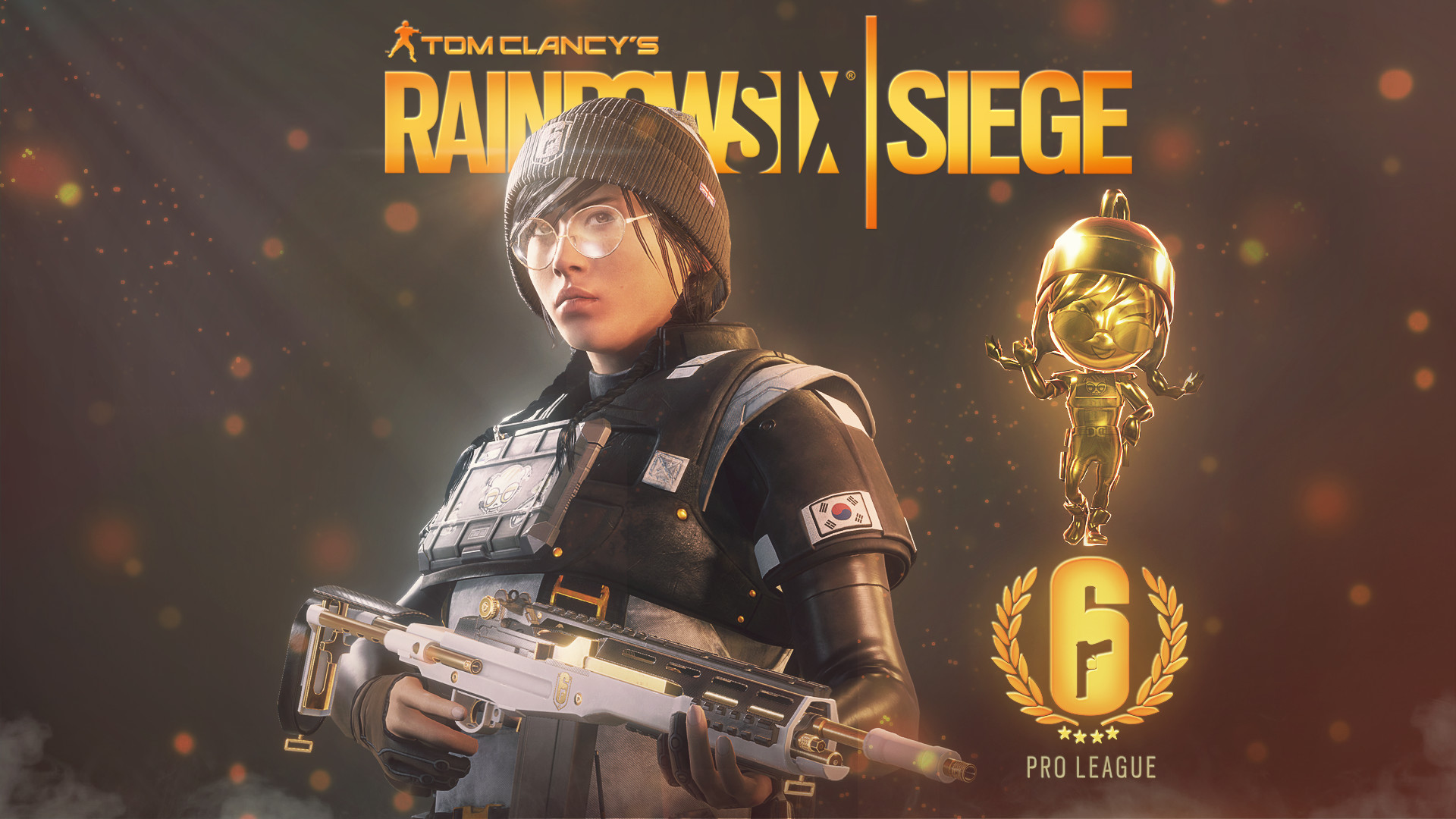 Celebrate the Rainbow Six Siege Pro League with Dokkaebi's Gold Chibi charm, Starlight uniform, Electron headgear and Gamma-Ray weapon skin for the Mk 14 EBR.