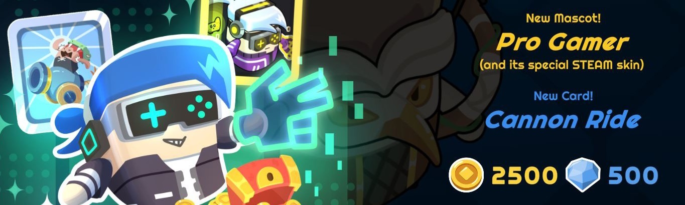 The Steam version of the game will include the Steam-exclusive mascot character PRO GAMER. Also available with the Steam purchase is a new skill card CANNON RIDE. Grab the Steam version now with a 20% discount, and enjoy its special perks.