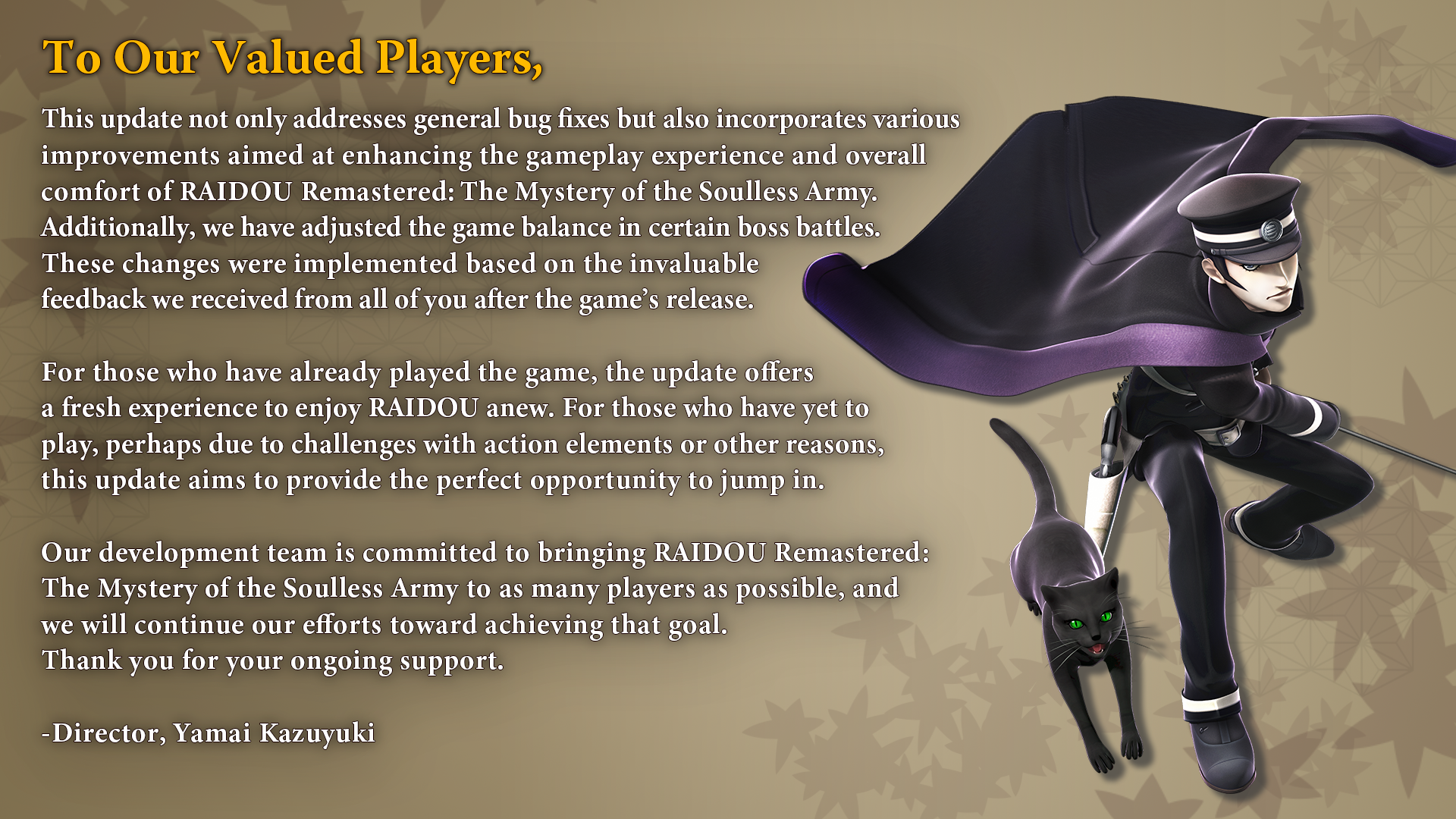 We have released patch 1.10 for RAIDOU Remastered: The Mystery of the Soulless Army. Additionally, accompanying this update, we would like to share a message from the game's Producer/Director, Yamai Kazuyuki.