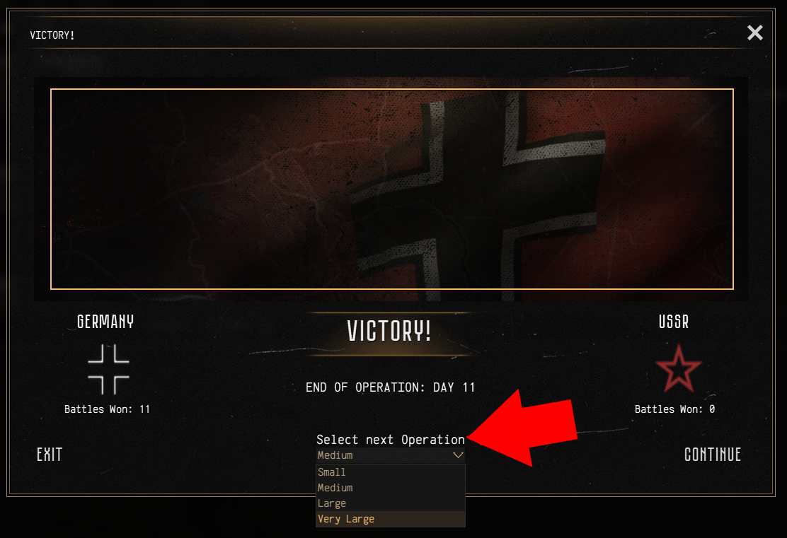 We have added a new option to Conquest that appears when you complete any operation.Previously, after winning an operation, you would be given the choice to either end your campaign and start a new one from scratch or continue your campaign in a special 'unlimited' operation that does not allow for any progression on the operation map.