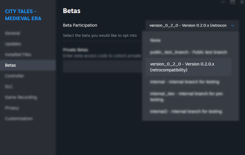 Right-click on “City Tales - Medieval Era” > Betas > in “Beta Participation” select “Version_0_2_0”