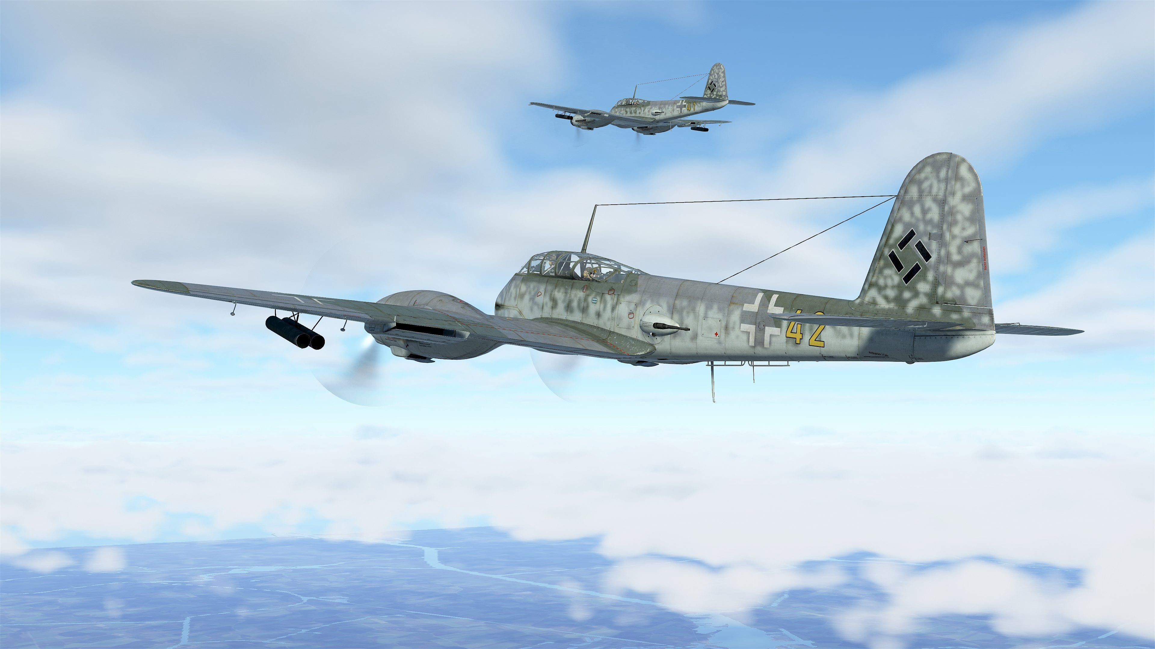 Similar to the previous campaign created by the author Jay Yarbrough, Gestapo Hunters about the British Mosquito crews, a fully voiced radio operator in the Me 410 rear cockpit will comment on events, provide headings to the next waypoint, and read the checklist during takeoff and landing procedures. He is responsible for communicating with ground stations, operating the latest in radio guidance systems in the aircraft (you will be briefed how to use your cockpit indicator in the first mission) and contolling the rear gun turrets in the event of enemy contact. This experience is as close as you can get to bringing the history of the German heavy night fighter crews to life on your personal computer, especially if you use virtual reality goggles.