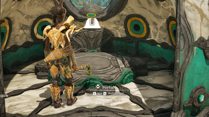 If you haven't played together before look for any portal AFTER you've built your Farm Town. If you try to use the multiplayer feature before your Farm has been built the portal will not offer the second option shown in the screenshot below: