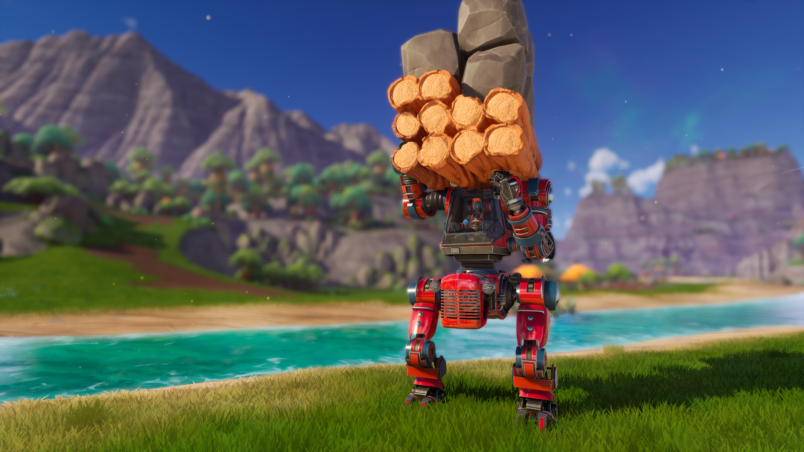 Your mech can now pick up, carry, and throw Logs and Boulders. These are dropped from Large Trees and Large Stones. Carry them back home and process them in the new Sawmill and Rock Crusher to get extra resources compared to cutting them down in the wild!