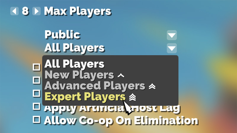 When configuring a lobby, hosts can now exclude those outside of one level equal to or above their own. Put another way, a new player can create a lobby accepting only new players, or advanced players, or expert players. An expert player can create a lobby accepting only expert players.