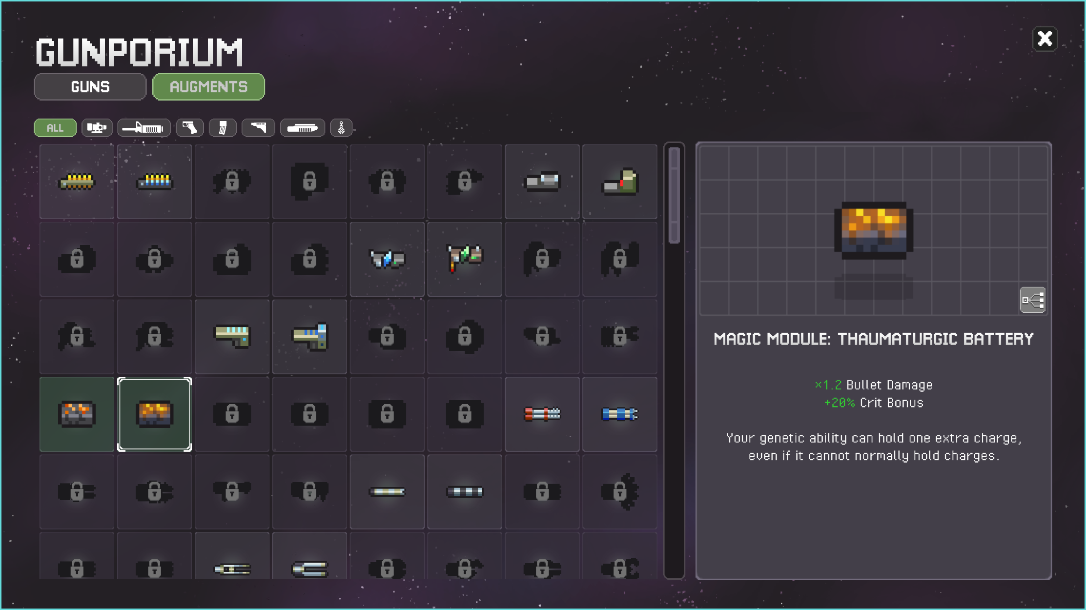 Here, you'll be able to find all the information about your Augments and Chassis. This is our first iteration of the Gunporium. Since it's been a such a highly requested feature, we wanted to release its core functionality first so you wouldn't have to wait any longer.