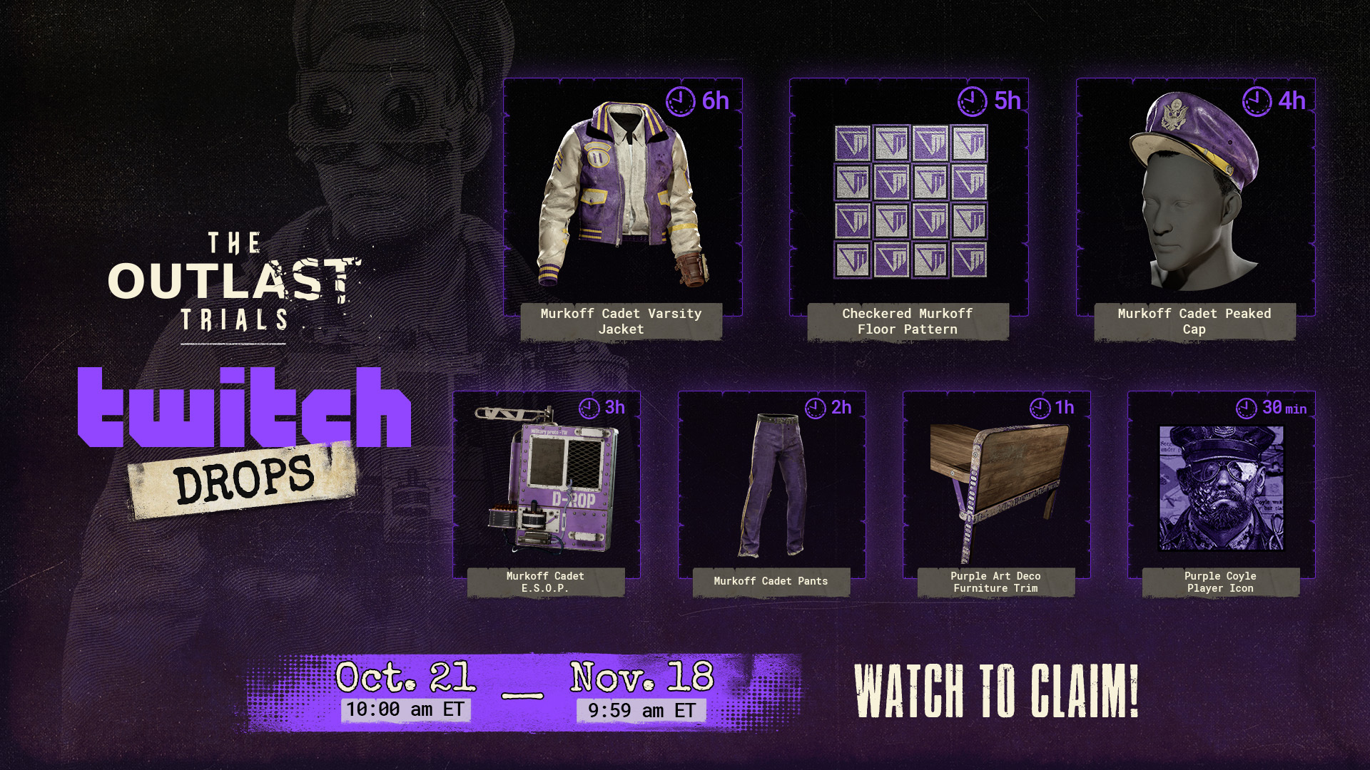 Once your Twitch account is linked, start watching The Outlast Trials streams to obtain exclusive cosmetic items which will be rewarded automatically once you reach the watch times.
