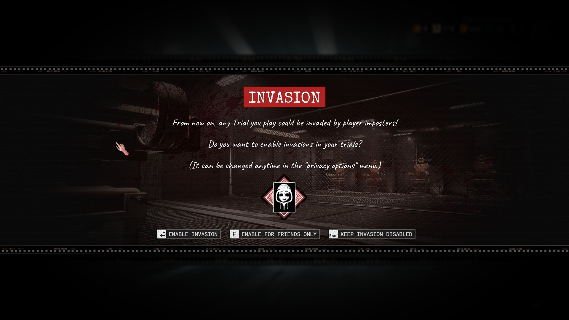 Your Invasion Trial Privacy and Group Privacy settings can be changed anytime in PRIVACY OPTIONS (via Terminal or Pause menu).